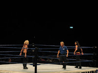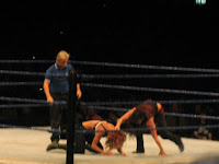 Sexy and sultry Diva Search 2004 finalist Michelle managed to escape a Widow's Peak and win the match with a McCool Backbreaker onto the slightly psychotic Diva. How I wish Torrie Wilson were here... :-/