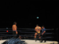 After nearly 6 hrs of serving many sweet-faced babes at work, I knocked off at 5 pm exactly and headed for early dinner at Lucky Plaza. Then I took a bus from there and reached the stadium rather early at 1810 hrs. Then I headed to the corridor with the vending machines, where I saw Shane Mardjuki aka the host of "Spell Cast" waiting for a friend. At 1840 hrs, the wrestlers turned up, and they came at this order...