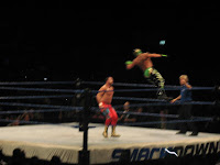 The Big Red Monster clearly had the bigger advantage, and managed to kick out from the sneak attack from Finlay's shillelagh. Kane then had a moment of humor with Finlay's partner-in-crime Hornswoggle (who had tried to interfere), when the leprechaun placed his hat onto Kane's head and tried to chokeslam him!! Kane went on to chokeslam Finlay and win the match... despite losing the match, Finlay would entertain the fans a little by doing that 'jump-clap-legs' thingy!